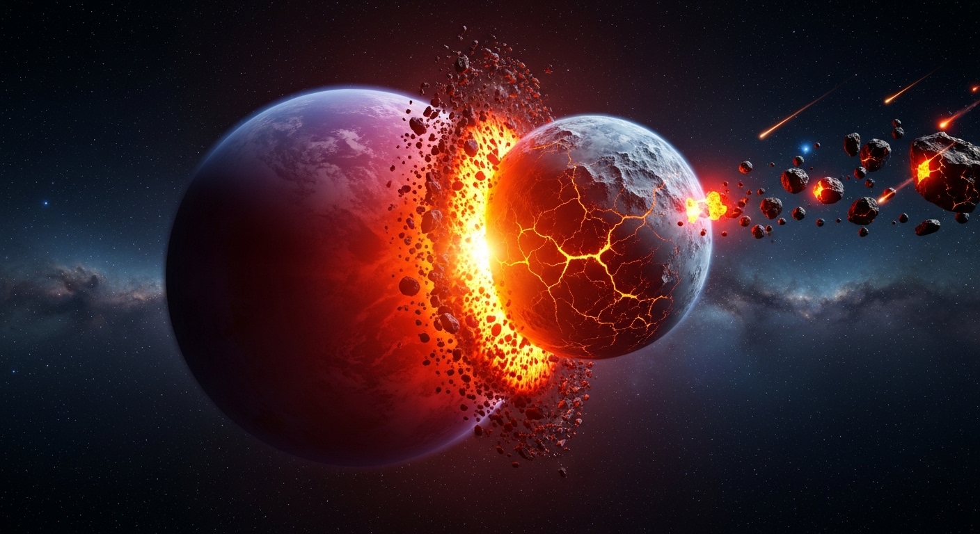 거대 충돌설에 따르면 약 45억 년 전, 화성만 한 크기의 천체 테이아가 원시 지구와 충돌했습니다. 당시 태양계는 현재보다 훨씬 많은 행성들로 붐볐으며, 적어도 20개에서 수십 개의 행성이 존재했을 것으로 추정됩니다. 테이아는 지름 6,000km까지 성장한 거대 천체였고, 궤도가 불안정해지면서 결국 원시 지구와 충돌하게 되었습니다. 이 충격으로 생성된 수많은 파편들이 모여 현재의 달을 형성했다는 것이 이 이론의 핵심입니다.