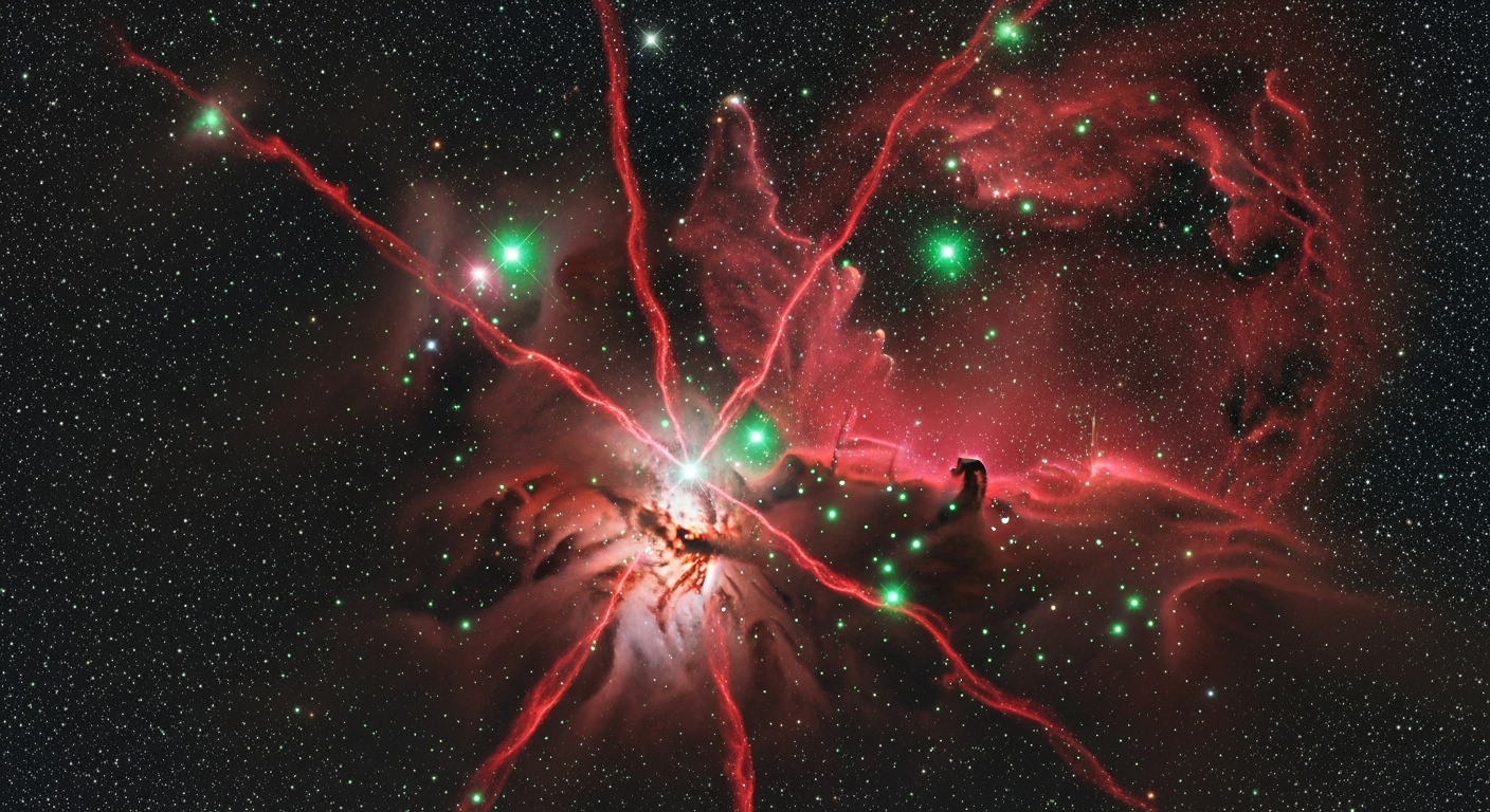 저는 이 사진을 처음 봤을 때 마치 거인의 손가락 같다는 생각이 들었습니다. 그런데 더 자세히 들여다보니 붉은 손가락 끝마다 작지만 선명한 녹색 빛이 보이더군요. 이 부분에는 철 원소가 유독 풍부하고, 충격파가 가장 강하게 부딪히는 곳이라 온도도 다른 곳보다 훨씬 뜨겁습니다. 정말 신기하게도 녹색 매니큐어를 바른 것처럼 보이는 독특한 풍경이었습니다.