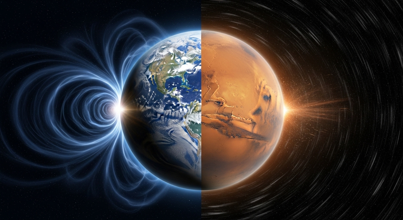 솔직히 이 부분을 알고 나니 테라포밍에 대한 낙관적 전망이 얼마나 허술한 전제 위에 서 있는지 보였습니다. 자기장은 단순히 '있으면 좋은' 옵션이 아닙니다. 대기를 붙잡아두고, 물을 보존하고, 태양풍(Solar Wind)으로부터 생명체를 보호하는 핵심 인프라입니다. 태양풍이란 태양에서 끊임없이 뿜어져 나오는 고에너지 입자의 흐름으로, 자기장이 없으면 행성 표면을 직접 때립니다.